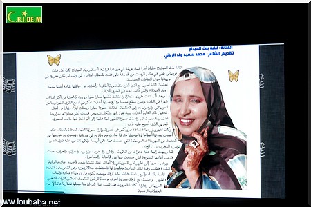 Loubaba Mint Meydah a profité de la présentation de son site, qui sera également disponible en Français et en Anglais, pour annoncer le lancement d’un concours de poésie arabe et de chants maures dans le but de perpétuer notre art et nos traditions.
