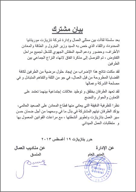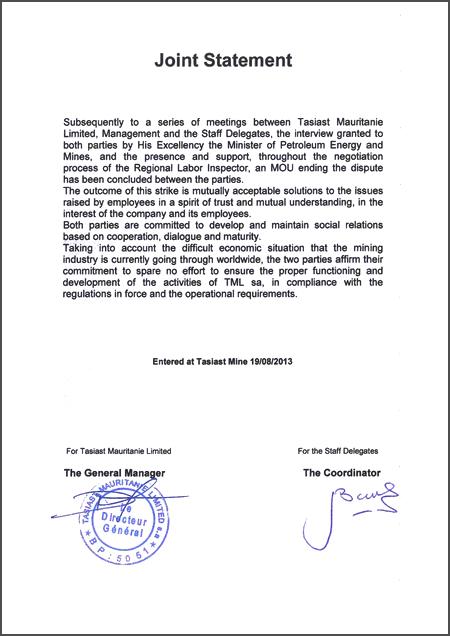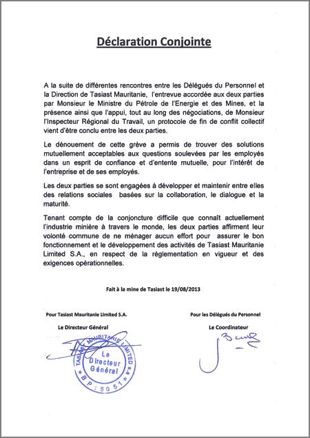 19-08-2013 20:23 - Tasiast Mauritanie / Délégués du Personnel : Déclaration conjointe