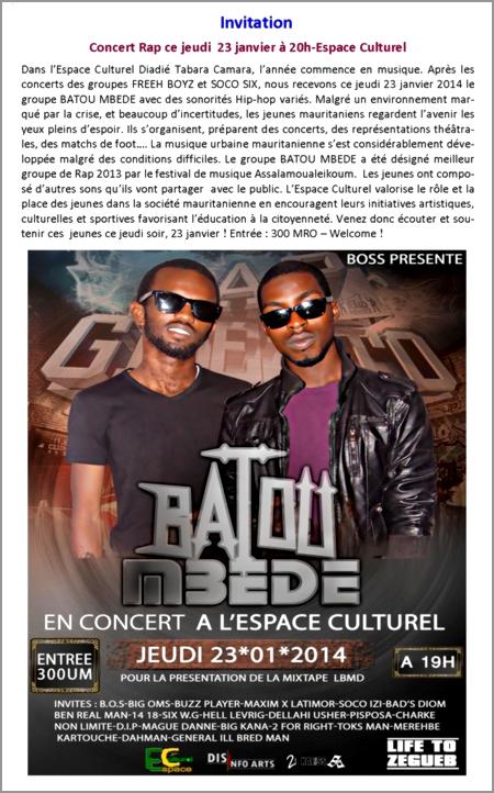 Dans l’Espace Culturel Diadié Tabara Camara, l’année commence en musique. Après les concerts des groupes Freeh Boyz Et Soco Six, nous recevons ce jeudi 23 janvier 2014 le groupe Batou Mbede avec des sonorités Hip-hop variés.