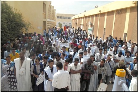 Ce lundi 10 mars 2014, au niveau de la Faculté des Sciences Juridiques et Economiques. Ce, en signe de colère contre le manque de volonté politique et la nonchalance des deux présidents de l’USTM, Univ-NKT ainsi que le Ministre de l’Enseignement Supérieur pour satisfaire les revendications estudiantines.