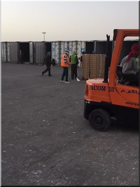 Débarqués par palettes, le produit est pris en charge par la société de manutention puis par les manœuvres pour être positionnés dans des conteneurs, mis à disposition sur le terrain plein par la société Rida Free Zone. C'est la société Maersk Line qui s'occupera ensuite de leur transport vers les clients européens et africains.