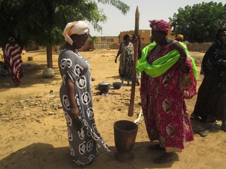 Larou : « il y’a des brisures de mil pilés avec la main et les brisures obtenus sont séparées de la farine avec un tamis, l’oseille de guinée nous provient de nos champs, on a préparé "Larou", qui peut se faire avec des pastèques et des arachides également. Nous avons ajouté dans ce plat des pastèques et cuisiné avec du bois de chauffe. On y retrouve du sel, de l’eau ».