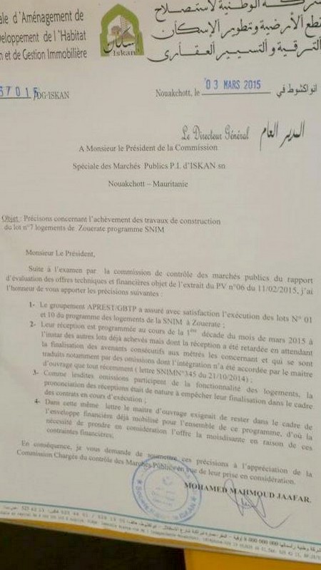 Le document divulgué à "Mourassiloun", est une note interne envoyée par le directeur général M. Mohamed Mahmoud Ould Jaafar, sous la référence 0757/2015 , au Président de la Commission spéciale des marchés de son entreprise. Cette note dit clairement :