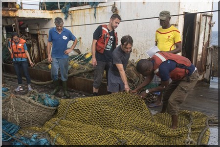 L’accueil de l’équipage, en majorité sénégalais, est chaleureux. « C’est bien ce que vous faites, soutient l’un des marins. C’est notre patrimoine, la mer. » D’ailleurs, il y a à bord Assane Seck, un observateur sénégalais de la Direction de la protection et de la surveillance des pêches qui semble prendre son travail à cœur. « Nous avons attrapé deux tortues dans les filets depuis notre départ, nous avons pu les remettre à l’eau », raconte-t-il.