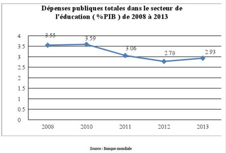 En dépit du taux d’échec de plus en plus élevé, les dépenses publiques totales du secteur de l’éducation en pourcentage du produit intérieur brut ne cessent d’enregistrer une importante baisse. Elles restent inférieures à 4% du PIB.