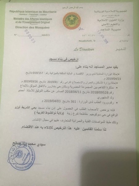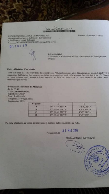 C’est alors que le Monsieur qui avait entrepris les travaux introduit une demande au ministère des affaires islamiques pour la construction d’une mosquée. Le ministère des affaires islamiques écrit au ministère délégué auprès du ministère de l’économie et des finances chargé du budget qui attribue au demandeur un terrain pour la construction d’une mosquée.
