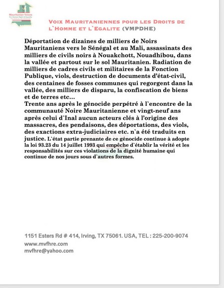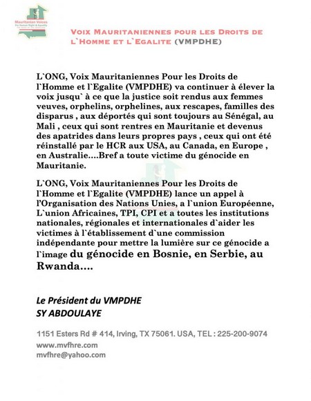 LONG, Voix Mauritaniennes Pour les Droits de lHomme et l’Egalité (VMPDHE) lance un appel à l’Organisation des Nations Unies, a l’union Européenne, l’union Africaines, TPI, CPI et a toutes les institutions nationales, régionales et internationales d’aider les victimes à l’établissement dune commission indépendante pour mettre la lumière sur ce génocide a l’image du génocide en Bosnie, en Serbie, au Rwanda….