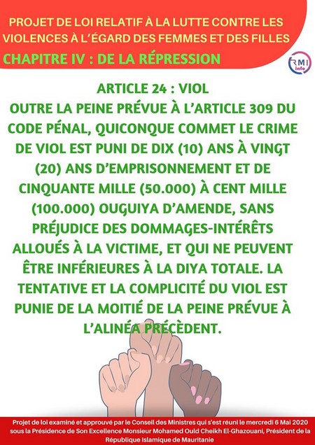 Tout en espérant que cette loi améliorera la vie des mauritaniennes en proposant des mesures judiciaires, sanitaires et sociales portant sur l’aide des victimes de cette pratique et qu’elle assurera pleinement son rôle afin que le crime soit puni.