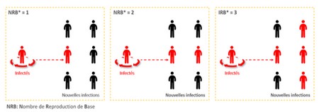 Par exemple, avec un NRB qui est égale à 4, la maladie sera transmise à 4 personnes par une personne infectée.