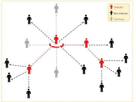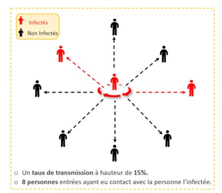 Comme montré dans le schéma ci-dessus, un seul individu infecté transmet le virus à 2 personnes en moyenne sur 8 contacts.