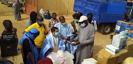 Et un autre don composé de quatre voitures de marque waw pour le transport des ordures ménagères offertes par l’Etat mauritanien. Le don de la GIZ est composé de cartons d’eau de javel, de bouteilles de gel alcoolisé, de neuf fontaines sanitaires, de 105 bouteilles à pompes, de hauts parleurs pour la sensibilisation et de banderoles.