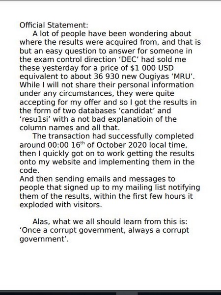Le responsable du site gabonais soupçonné d’avoir publié les résultats non officiels du Bac mauritanien 2020 a apporté des éclairages dans le document en anglais suivant sur ce scandale retentissant qui continue de défrayer la chronique et qui a contraint le ministère de l’Education mauritanienne à diligenter une enquête afin de situer les responsabilités.