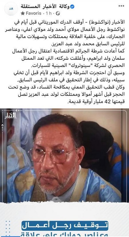 Selon nos confrères d'Al-akhbar, la gendarmerie mauritanienne a arrêté depuis quelques jours à Nouakchott, l’homme d’affaires Moulaye Ahmed Ould Moulaye et des éléments de la douane, sur fond de lien avec des biens appartenant à l’ancien président Mohamed Ould Abdel Aziz et des facilités financières qui lui sont accordées.
