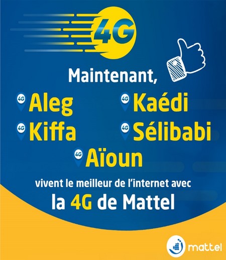 Mattel - Poursuivant sans relâche son programme de couverture 4G au niveau national, Mattel a le plaisir d’annoncer à son aimable clientèle que son service 4G est maintenant disponible dans les villes de Aleg, Kaédi, Kiffa, Sélibabi et Aioun. Ainsi, le service 4G de Mattel est désormais disponible dans 11 villes du pays : Nouakchott, Nouadhibou, Zouerate, Rosso, Akjoujet, Atar, Aleg, Kaédi, Kiffa, Sélibabi et Aioun.