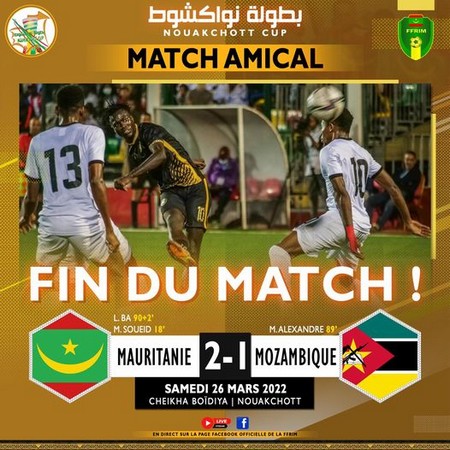 Pour préparer les éliminatoires de la CAN 2023 qui débutent en juin prochain, la Mauritanie se frottait au Mozambique. A l’arrivée, ce sont les Mourabitounes qui l’emportent (2-1). La Mauritanie avait ouvert le score par l’intermédiaire de Mohamed Soeuid, à la 18e minute. Le Mozambique réussira à revenir au score grâce à Melque Alexandre (90e).