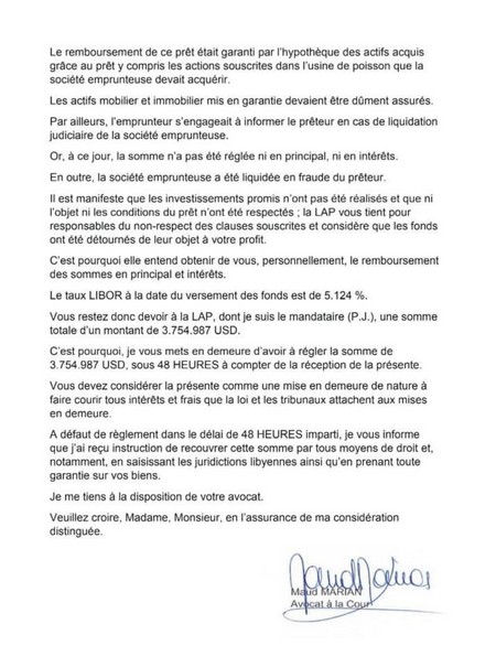 La lettre indiquait : « Il est clair que les investissements promis n'ont pas été réalisés et que l'objet ou les conditions du prêt n'ont pas été respectés ; Libyan Africa Investment Portfolio vous tient pour responsable du non-respect des termes de l'accord et considère que les fonds ont été détournés à votre profit. Pour cette raison, ils aimeraient obtenir de vous en personne le remboursement du montant initial et des intérêts à un ratio LIBOR de 5,124 % à compter de la date de déboursement des fonds. Par conséquent, vous demeurez redevable à Libyan Africa Investment Portfolio, notre client (voir documents joints) d’un total de 3 754 987 US$.»