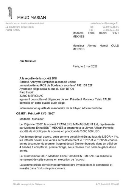 Dans sa lettre, l'avocate a souligné qu'« en cas de non-paiement dans les 48 heures, je vous informe que j'ai reçu des instructions pour recouvrer cette somme par tout moyen légal, notamment en recourant à la justice libyenne pour saisir vos biens personnels.»