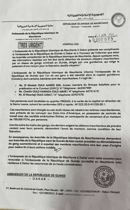 Le gang, dirigé par une guinéenne, compte trois mauritaniens à savoir El Ghotob Ould Ahmed Sidi, ancien membre du Groupe Salafiste pour la Prédication et le Combat (GSPC) (N° Téléphone : 663307989), Cheikh Ould Hamada Ould Amar (N° téléphone: 65751419) et El Mourteii Ould Lemat (N° Téléphone: 62937478), avait révélé l’Ambassade de Mauritanie à Dakar dans une correspondance adressée aux autorités guinéennes en date du 23 juin 2022.