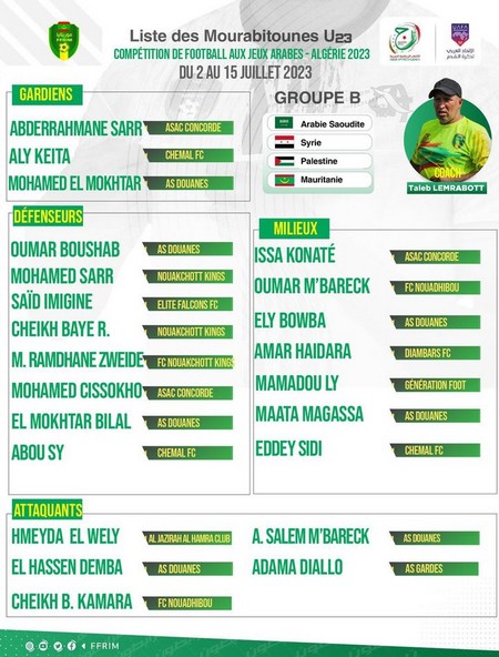 RIM Sport - Le Sélectionneur des Mourabitounes U23, M. Taleb Lemrabott a communiqué, mardi 27 juin, la liste des joueurs convoqués pour les quinzièmes Jeux Panarabes qui tiendront du 5 au 15 juillet prochain, en Algérie.