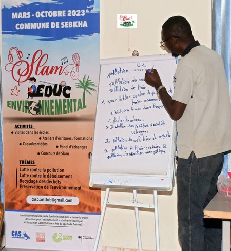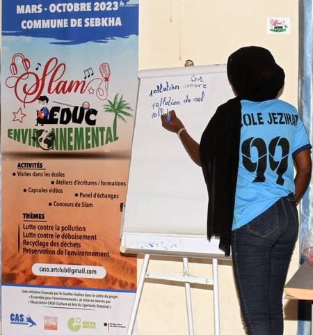En outre les deux jours d’atelier d’écriture slam et environnement ont été animés par Sidi Med Abd El Wedoud et la team du CASO au profit des élèves sur des thématiques telles que la pollution, la lutte contre le déboisement, le recyclage de déchets, la préservation de l’environnement. Cette séance a permis aux participants de passer de l’idée d’écriture des textes slam (style, forme, rédaction,diction,déclamation) dans le but de conscientiser et impacter.